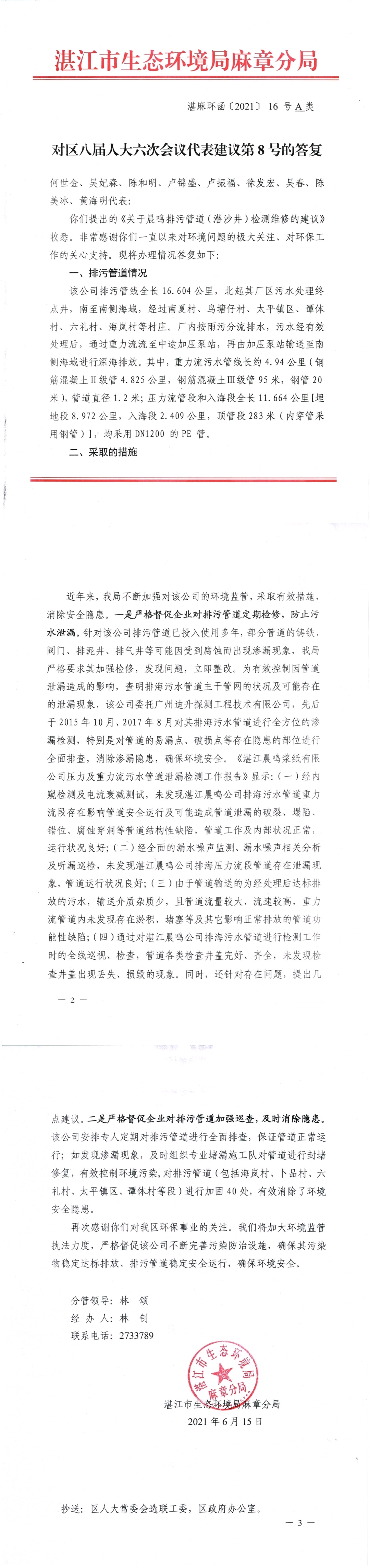 区生态环境分局对区八届人大六次会议代表建议第8号的答复